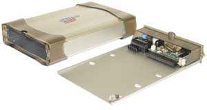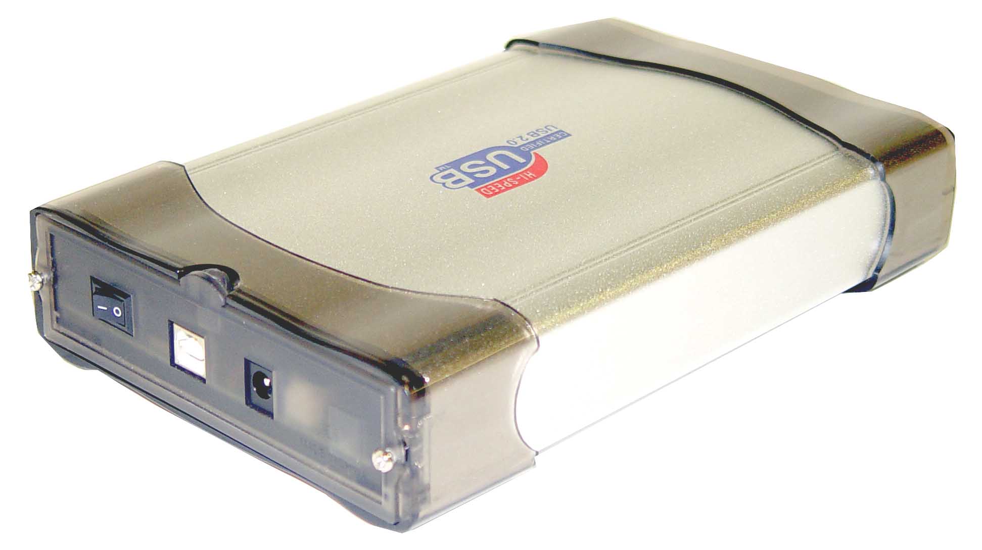 Aluminum main enclosure, USB2.0 data cable, AC adapter, driver CD, and