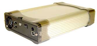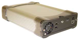 Aluminum main enclosure, USB2.0 data cable, AC adapter, driver CD, and